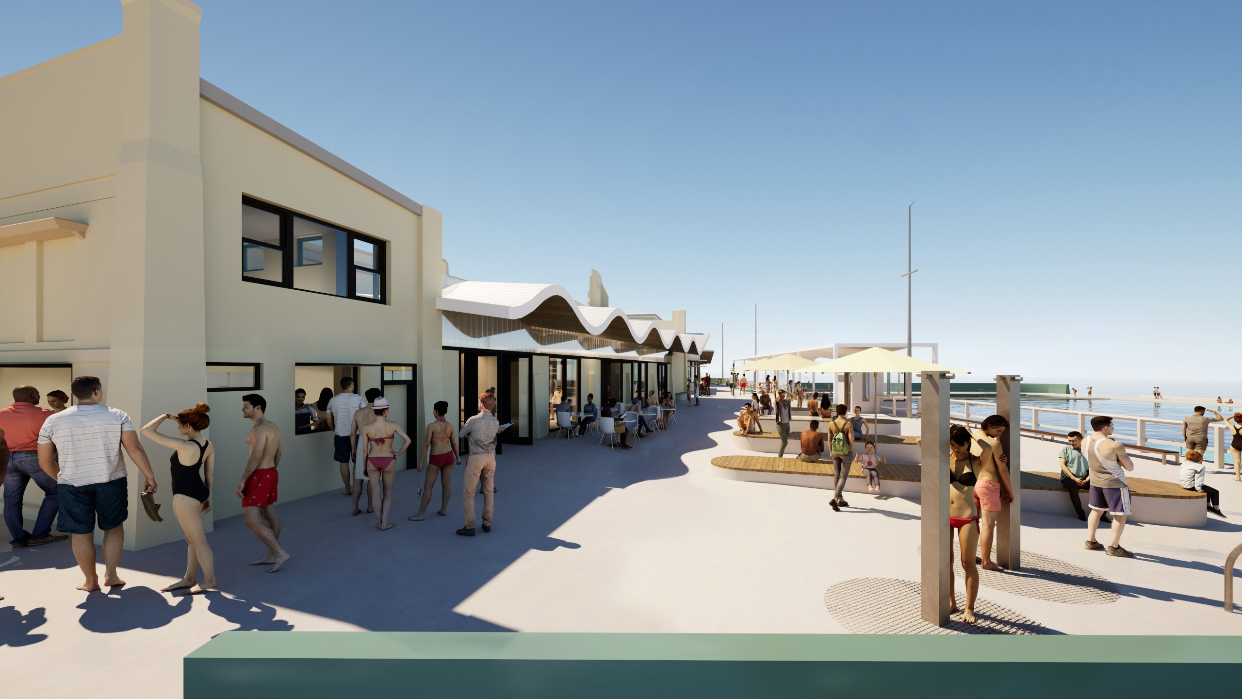 Stage Two of our revitalisation of Newcastle Ocean Baths will see the renewal of the pavilion buildings, delivering new amenities that include a mix of open and enclosed spaces for changing, as well as new toilets and showers. The upgrade will also include a changing places facility, an accessible toilet and two private family / agender facilities. We’re designing these facilities to meet the needs of our whole community both now and into the future, recognising that everyone’s needs are different. This mix provides more options for visitors including those who want more privacy than the current amenities offer, and those who need extra space for specialised equipment or support.